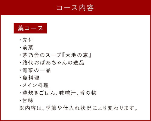 商品説明 名称 葉(よう)コース(2名様分) ※ワンドリンク・珈琲付き コース内容 先付 前菜 茅乃舎のスープ『大地の恵』 路代おばあちゃんの逸品 旬菜の一品 魚料理 メイン料理 釜炊きごはん、味噌汁、香の物 甘味 ※内容は、季節や仕入れ状況により変わります。