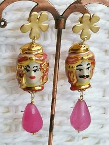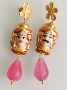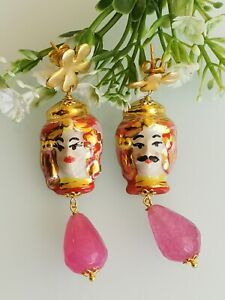 orecchini con teste di moro in ceramica di caltagirone e gocce agata rosaカルタジローネセラミックピンクアゲートドロップダークブラウンヘッドイヤリング※注意※NYからの配送になりますので2週間前後お時間をいただきます。