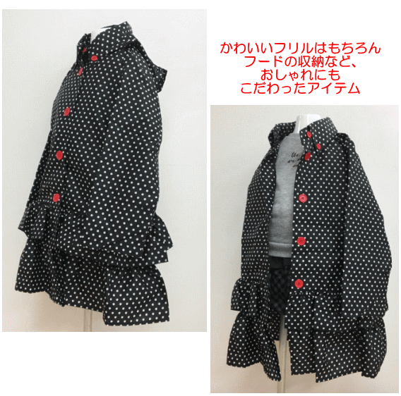 **++ポスト投函送料無料【オレンジボンボン】++** Orange Bonbon キッズレインコートドット×ブラック柄 【収納型フード付き】110/120cmf
