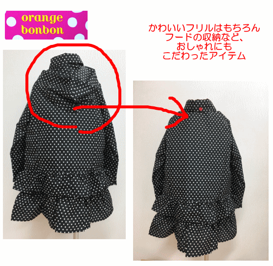 【オレンジボンボン】 Orange Bonbon ●素材 ポリエステル100% (一部ポリ塩化ビニル樹脂使用) ●収納型フード→フードが不要な時は、衿に簡単に収納できます♪