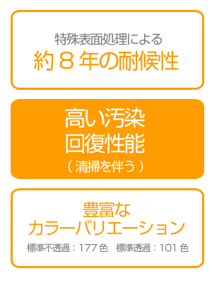 製品仕様 素材 ポリ塩化ビニル 厚さ(粘着剤を含む) 0.08mm 粘着力(N/25mm) 20 引張強度(N/25mm) 33 伸び 120% 寸法安定性 0.5mm 使用温度範囲 -30℃〜80℃ 最低接着温度 10℃ 耐候性 約5年 耐候性・耐汚染性を飛躍的に高める表面処理層により、長期に渡り初期の美しさを保ちます! 特殊表面処理により約8年の耐候性 表面にフッ素コーティングを施しているため汚れの付着度合いが少なく、また清掃による汚染回復性に非常に優れています。