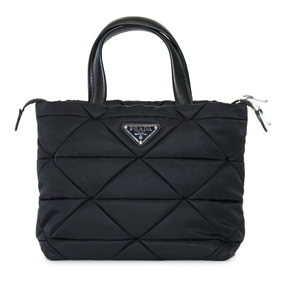 縦21cm、幅24cm、マチ13cm 【素材】レザー・再生ナイロン 【仕様】 パッド入りキルティングモチーフ ナッパレザーのハンドル 取り外し・調節可能なロゴプリント入りナイロンショルダーストラップ(長さ:90cm) 取り外し可能なファスナー付ナイロンポーチ メタルパーツ フロントにエナメルメタルのトライアングルロゴ付 ファスナー開閉式 プラダロゴ入りナイロンライニングにポケット2個付(1個はファスナー付) 【付属品】保存袋 【商品説明】 PRADAのパデッドナイロン トートバッグ。