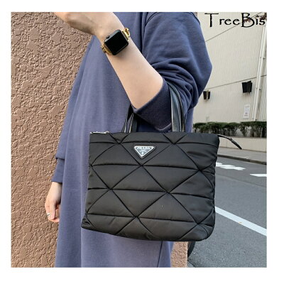 ナイロンのキルティングモチーフにトライアングルロゴとナッパレザーのハンドルがスタイリッシュで多機能なトートバッグ・ハンドバッグ。
