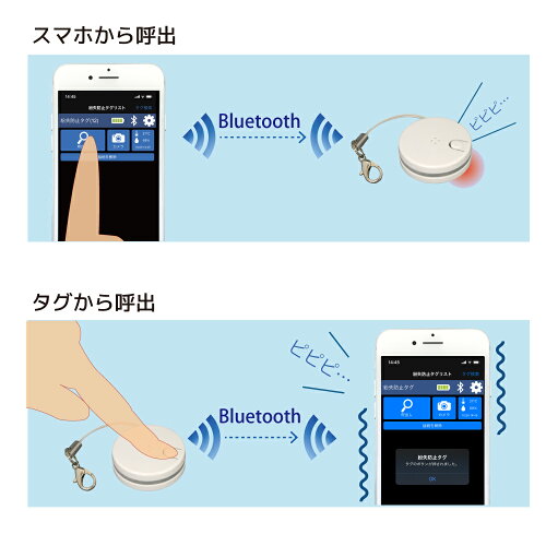 ソフトウェア ●iOS:紛失防止タグ(App Storeより無償ダウンロード) ●Android:紛失防止タグ(Google Playより無償ダウンロード) ※ 呼び出しやおしらせの機能を使用するには、スマホでアプリを起動(バックグラウンドでの起動を含む)しておく必要があります。